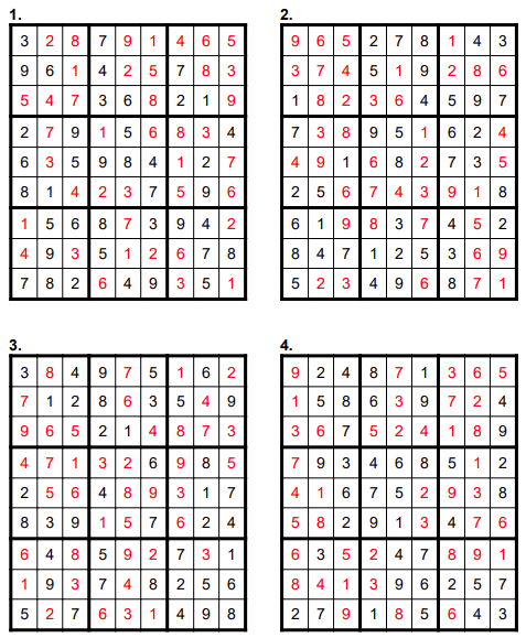 Sudoku: each 3×3 grid and each row should contain the numbers 1-9 with no repeats.